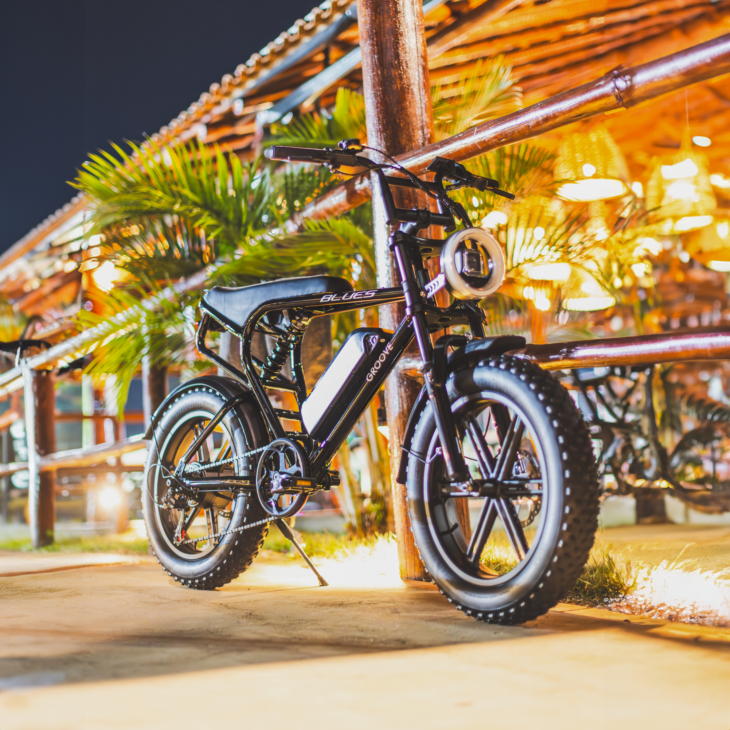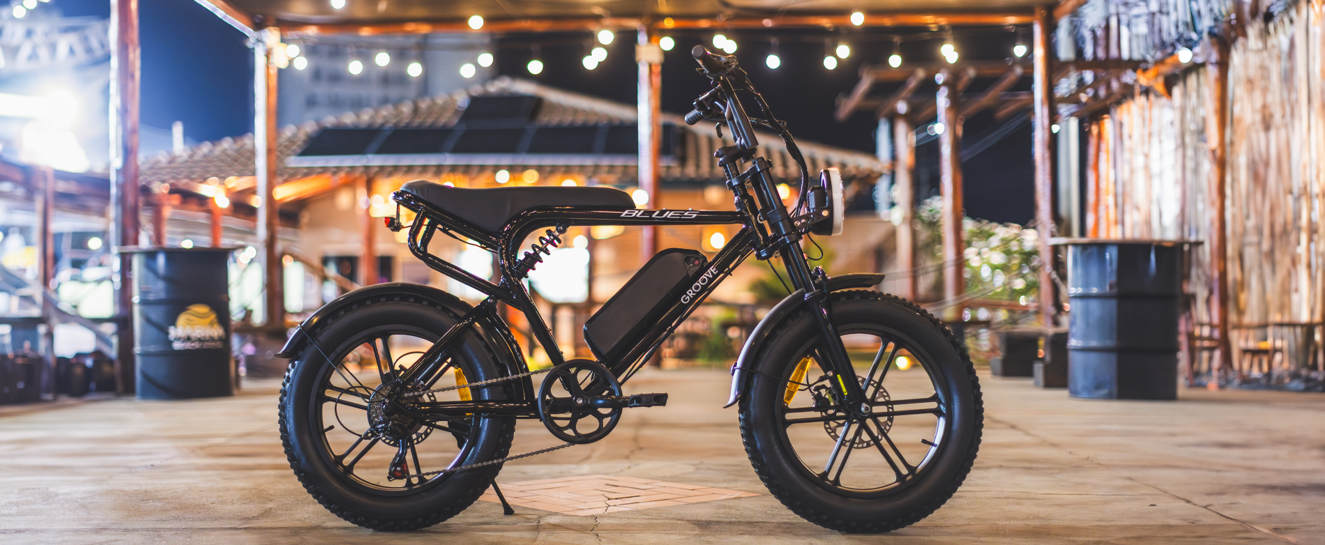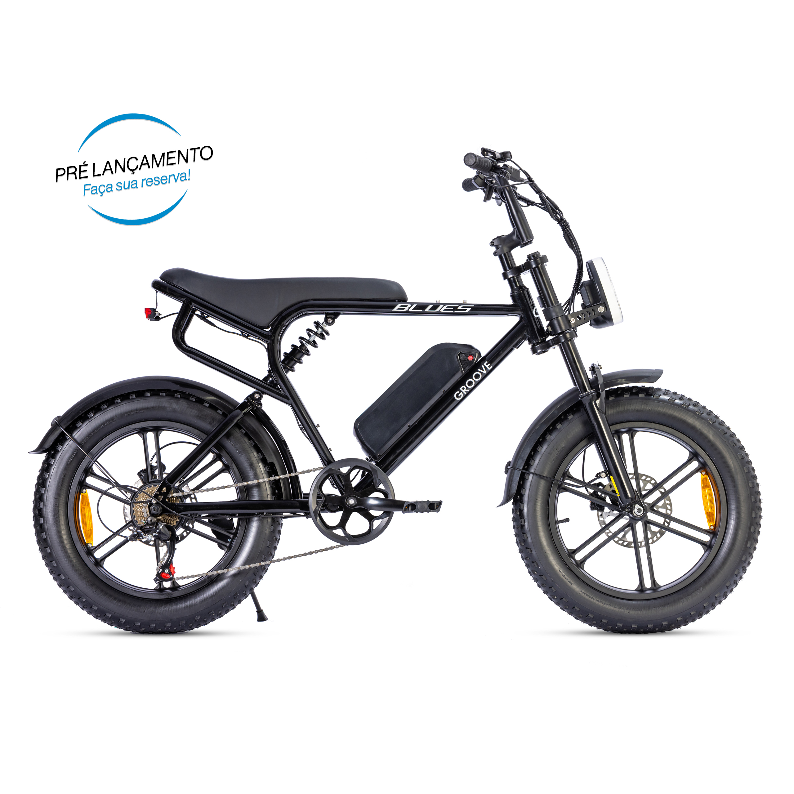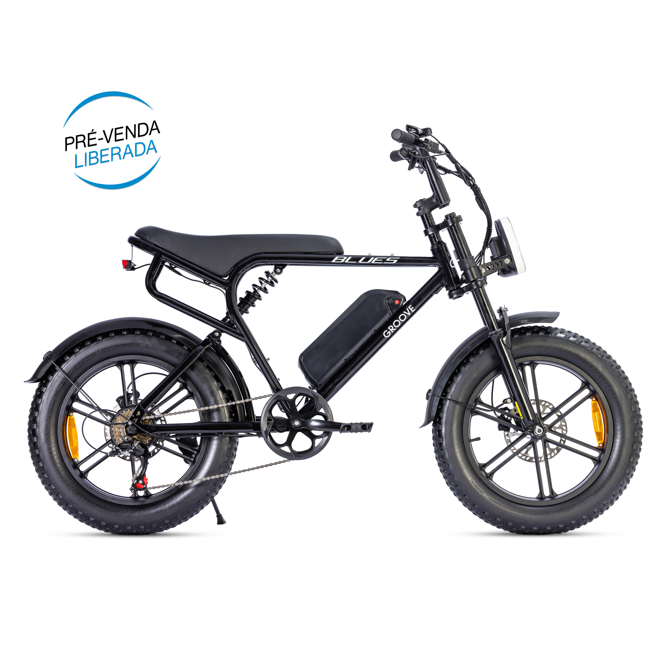 Esqueça o trânsito e as ladeiras. A Groove E-Blues é a união perfeita de potência (750W) e design icônico de Fat Bike.