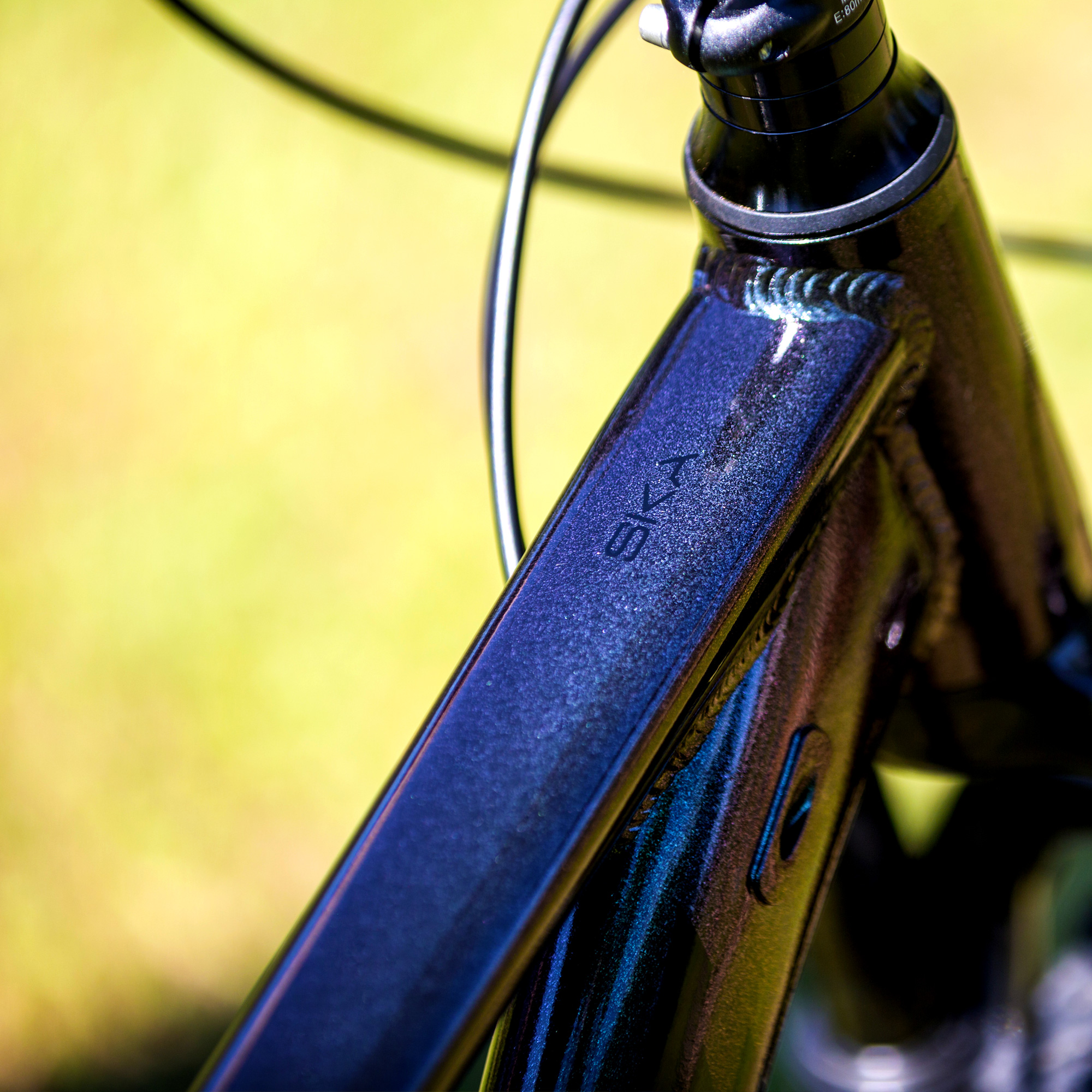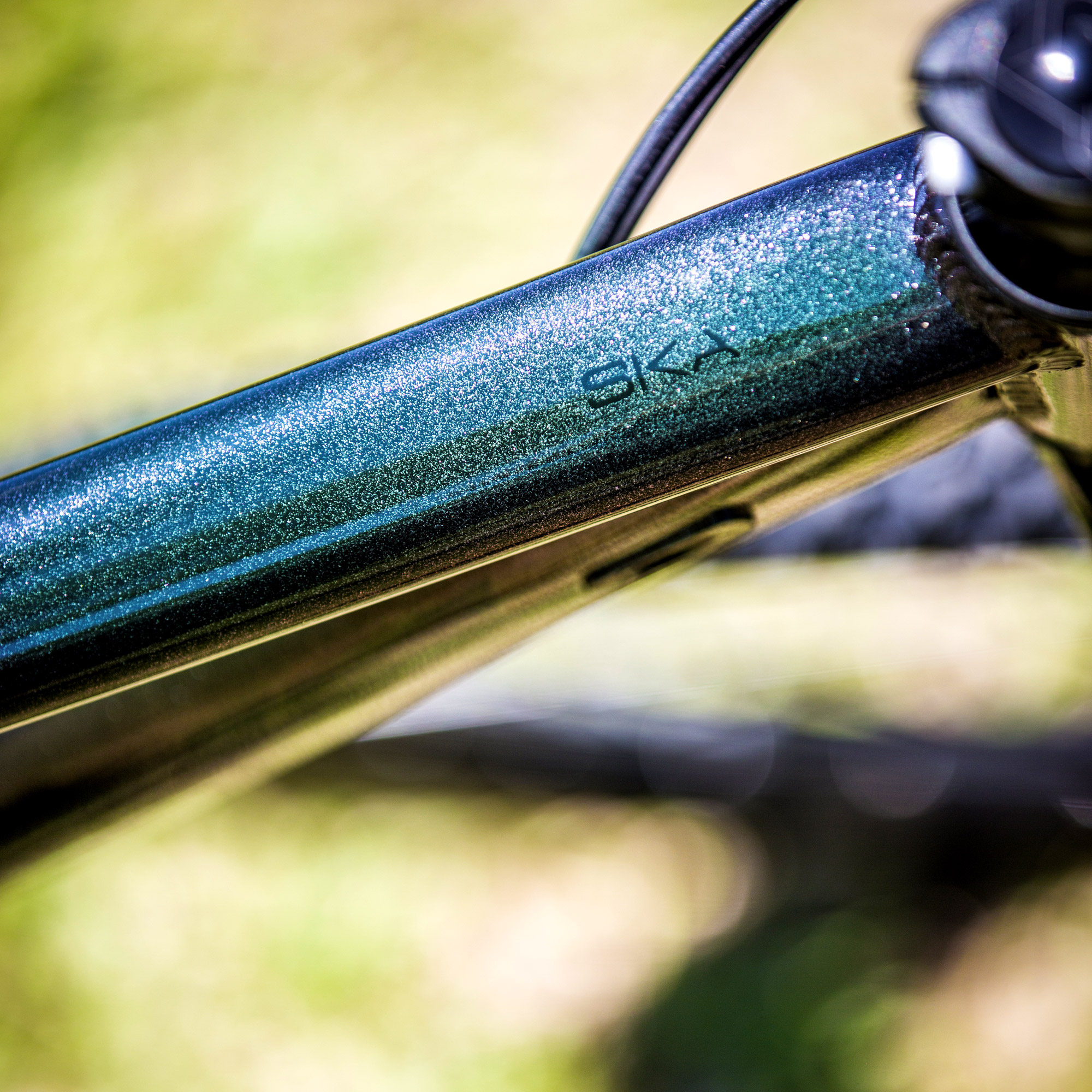 Grafismo com as novas cores Prism camaleão, o quadro da bike muda de cor conforme a luz do sol.